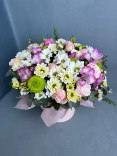 Эта элегантная шляпная коробка наполнена нежными розами, яркими альстромериями и великолепными хризантемами. Комбинация этих цветов создает неповторимое сочетание, которое идеально подойдет для особого случая или просто для того, чтобы порадовать близких своей красотой и изяществом. Нежные оттенки и изысканный дизайн этой композиции точно подчеркнут Вашу неповторимость и восхитят всех вокруг.